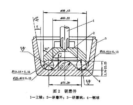 1 哈氏可磨性测定仪(简称哈氏仪):如图1所示。电动机通过蜗轮、蜗杆和一对齿轮减速后,带动主轴和研磨环以(20+1)r/min的速度运转。研磨环驱动研磨碗内的8个钢球转动,钢球直径为25.4mm,由重块、齿