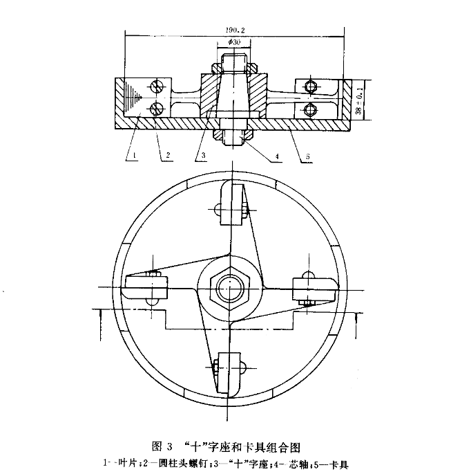 由“十”字座上有4个臂,用M6圆柱头螺钉和螺母将叶片固定在臂上。“十"字臂上有长形的螺钉孔,其长度应