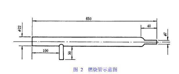 2.2 燃烧管:总长约650mm,一端外径约22mm,内径约19mm、长约610mm,距管口约100mm外接有外径约8mm、