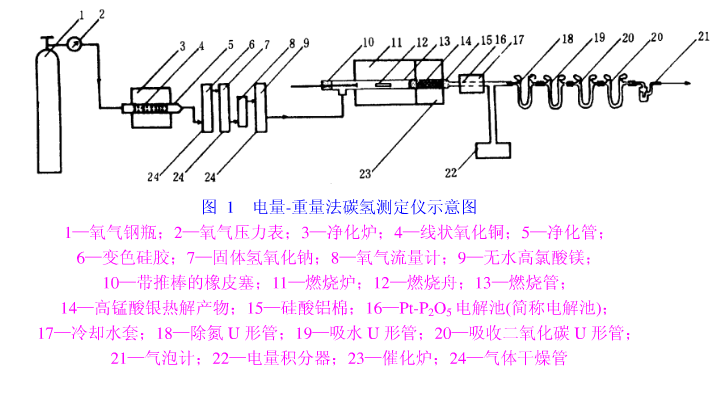 电量-重量法碳氢测定仪(简称测定仪)由氧气净化系统、燃烧装置、铂-五氧化二磷电解池、电量积分器和