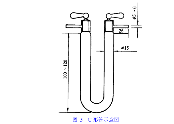 5.2 吸水U形管:如图5.直径约15mm的U形管,内装无水高氯镁或无水氯化钙,装药部分高100mm~120mm。