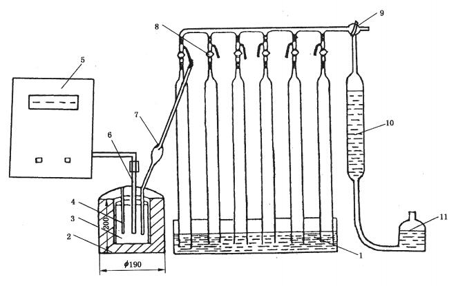 1-水槽;2-加热炉;3-铜加热体,4-试样管;5-温度测控仪;6-测温电偶;7-缓冲球;8-三通;9-三通;