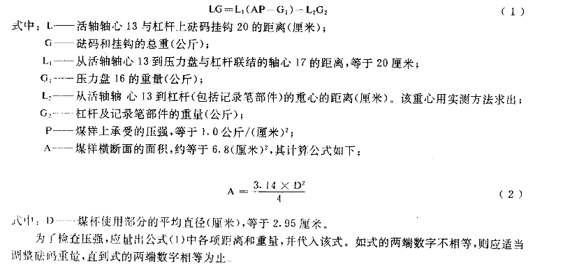 (2)带平衡铊的仪器,首先调节平衡铊的位置,使其与带压力盘和记录笔部件的杠杆平衡(两边力矩相等,杠杆成水平),再将平衡铊固定。用下列公式检查压强: