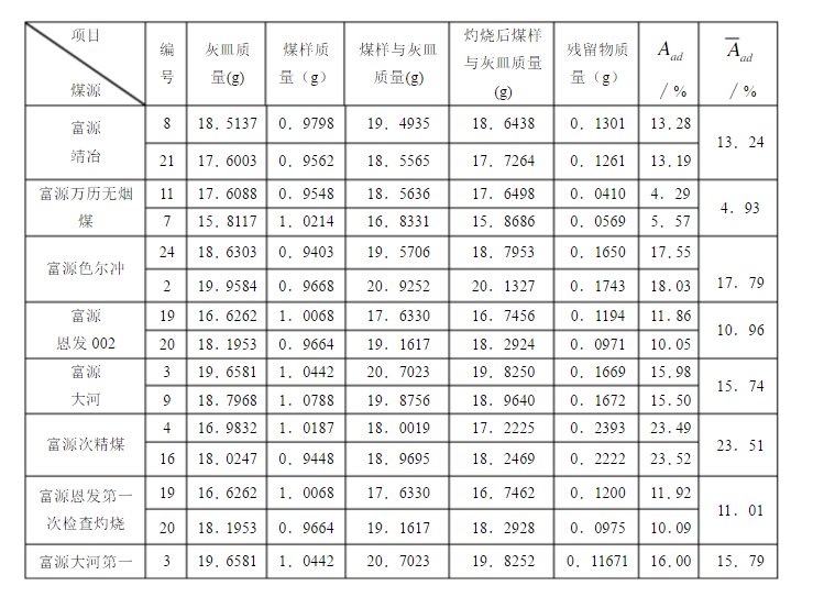 将装有煤样的灰皿放在预先加热至815ºC左右的灰分快速测定仪的传送带上,煤样自动送入仪器内完全灰化,然后送出。以残留物占煤样的质量分数作为煤样的水分。